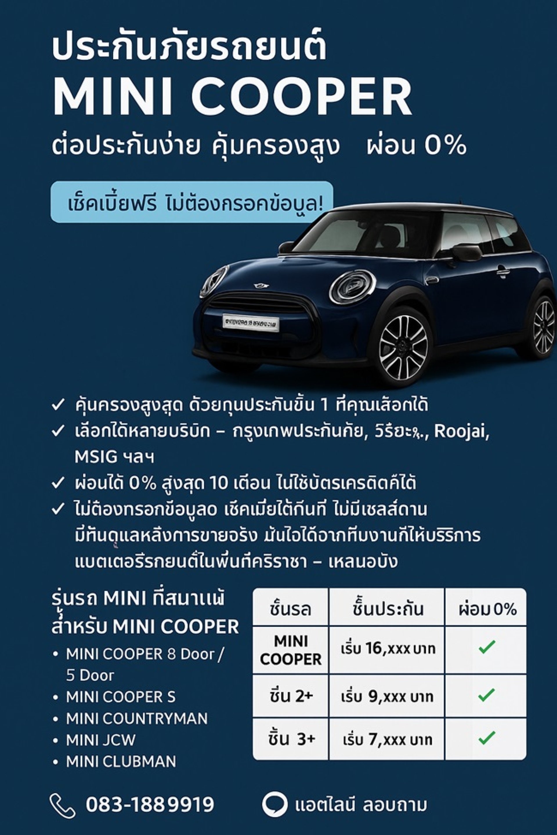 ถ้าคุณกำลังมองหา ประกันรถยนต์สำหรับ MINI COOPER ที่คุ้มค่า เชื่อถือได้ และจัดการง่ายแบบออนไลน์
