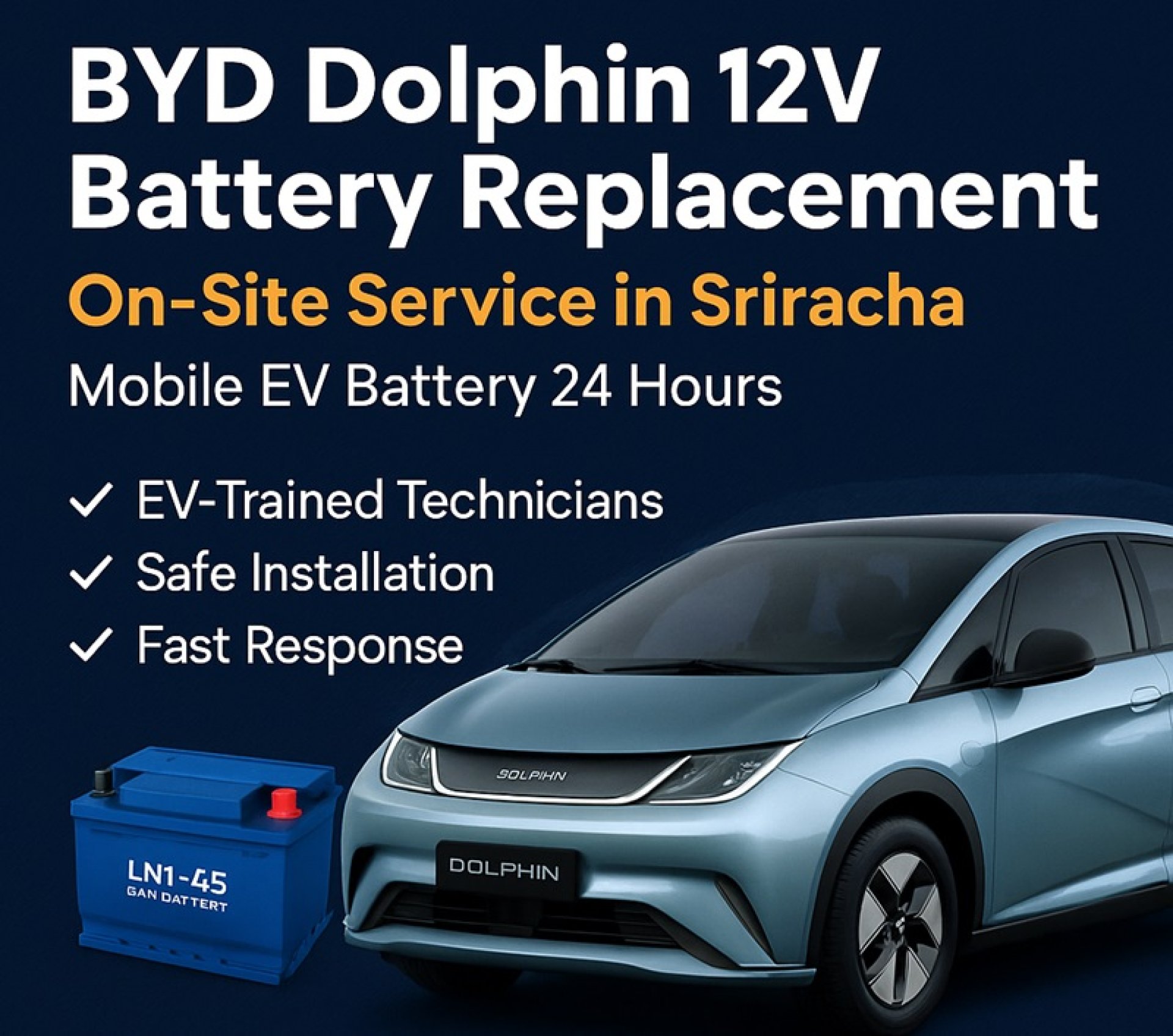 Battery24 Sriracha provides a professional on-site 12V battery replacement service for BYD Dolphin, covering Sriracha, Laem Chabang, and nearby areas, available 24 hours a day.