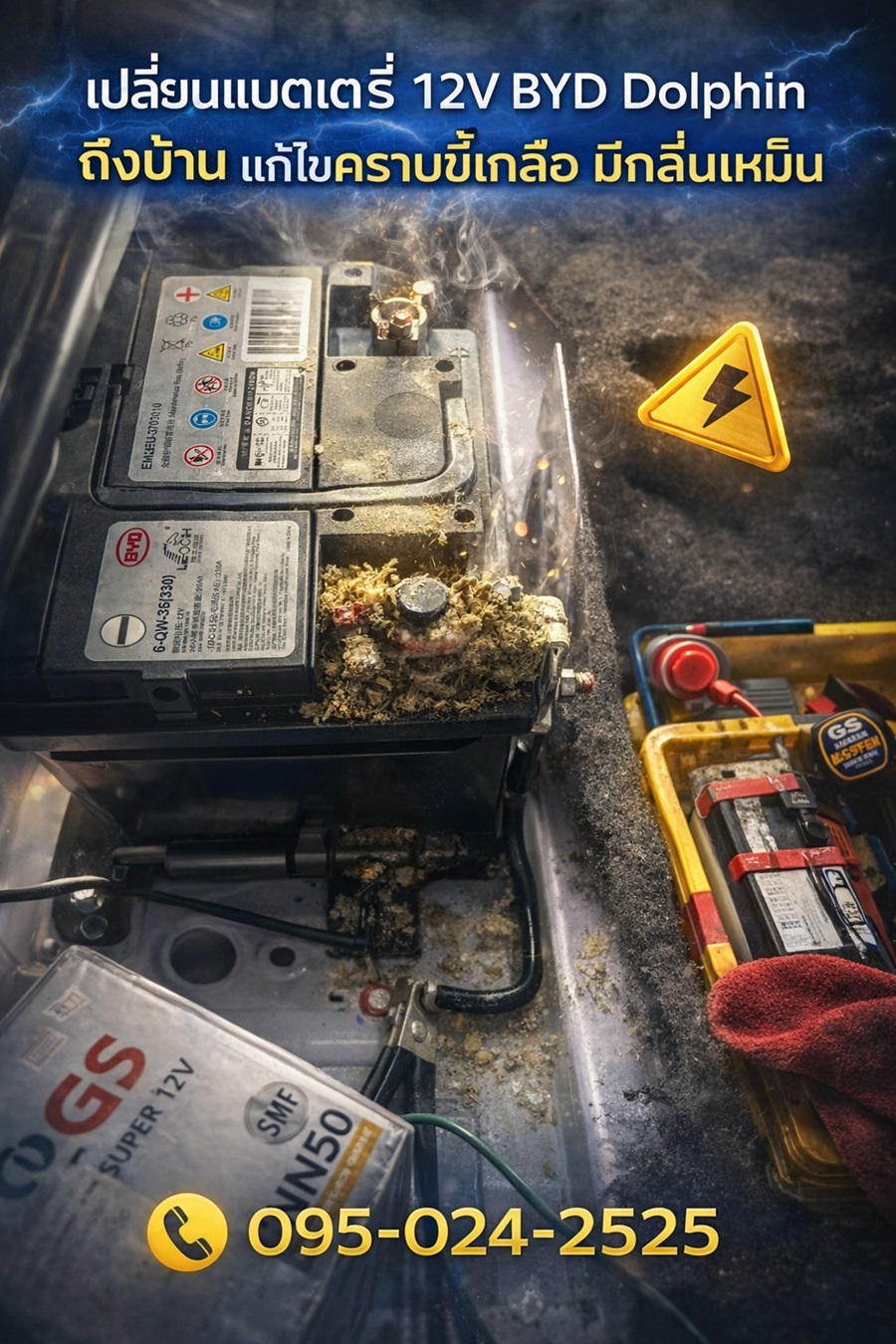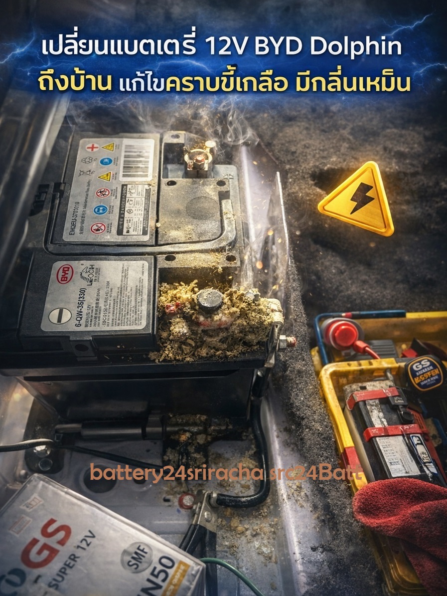 เปลี่ยนแบตเตอรี่ 12V BYD Dolphin ศรีราชา รถ EV แบตหมด สตาร์ทไม่ติด กลิ่นเหม็นหรือคราบขี้เกลือ