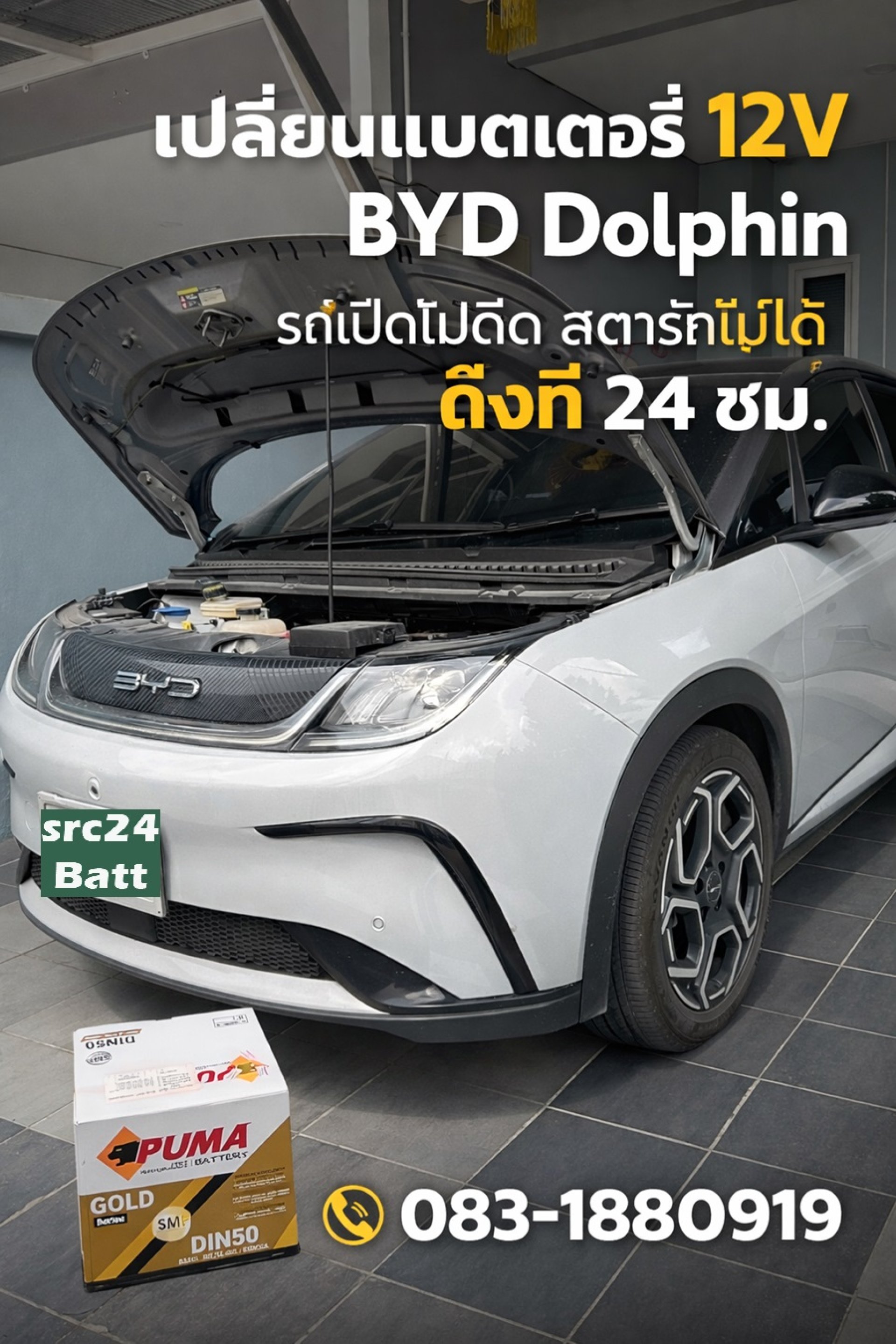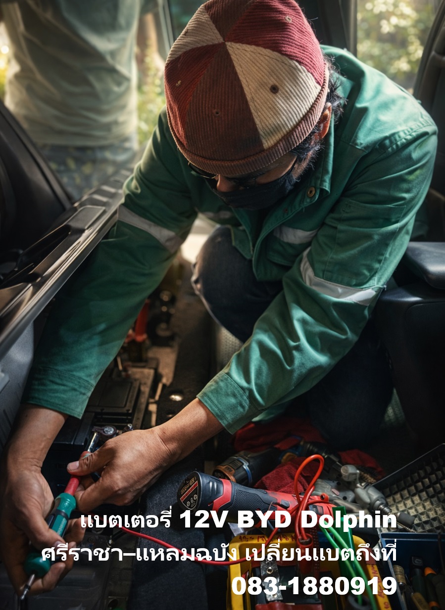 เปลี่ยนแบตเตอรี่ 12V BYD Dolphin ศรีราชา เส้นเก้ากิโล บริการถึงบ้าน 24 ชั่วโมง รถแบตหมดทีหมู่บ้านเดอะมิกซ์ทาวน์